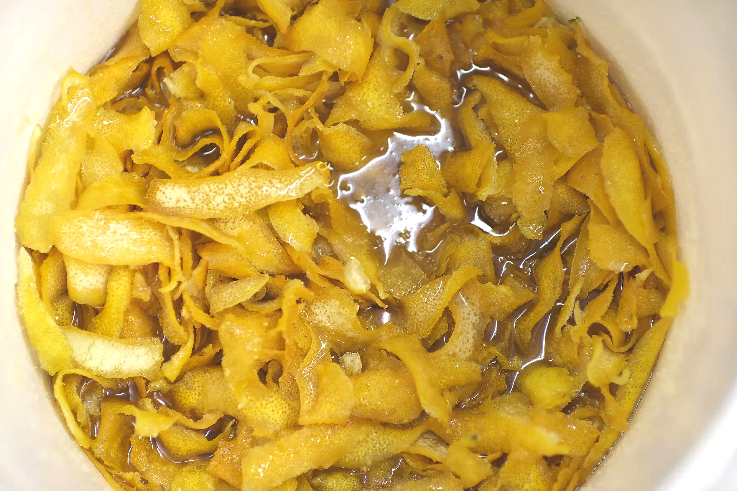 Four small cups filled with a yellowish liquid, arranged in a circle inside a metal container with a blue rim.